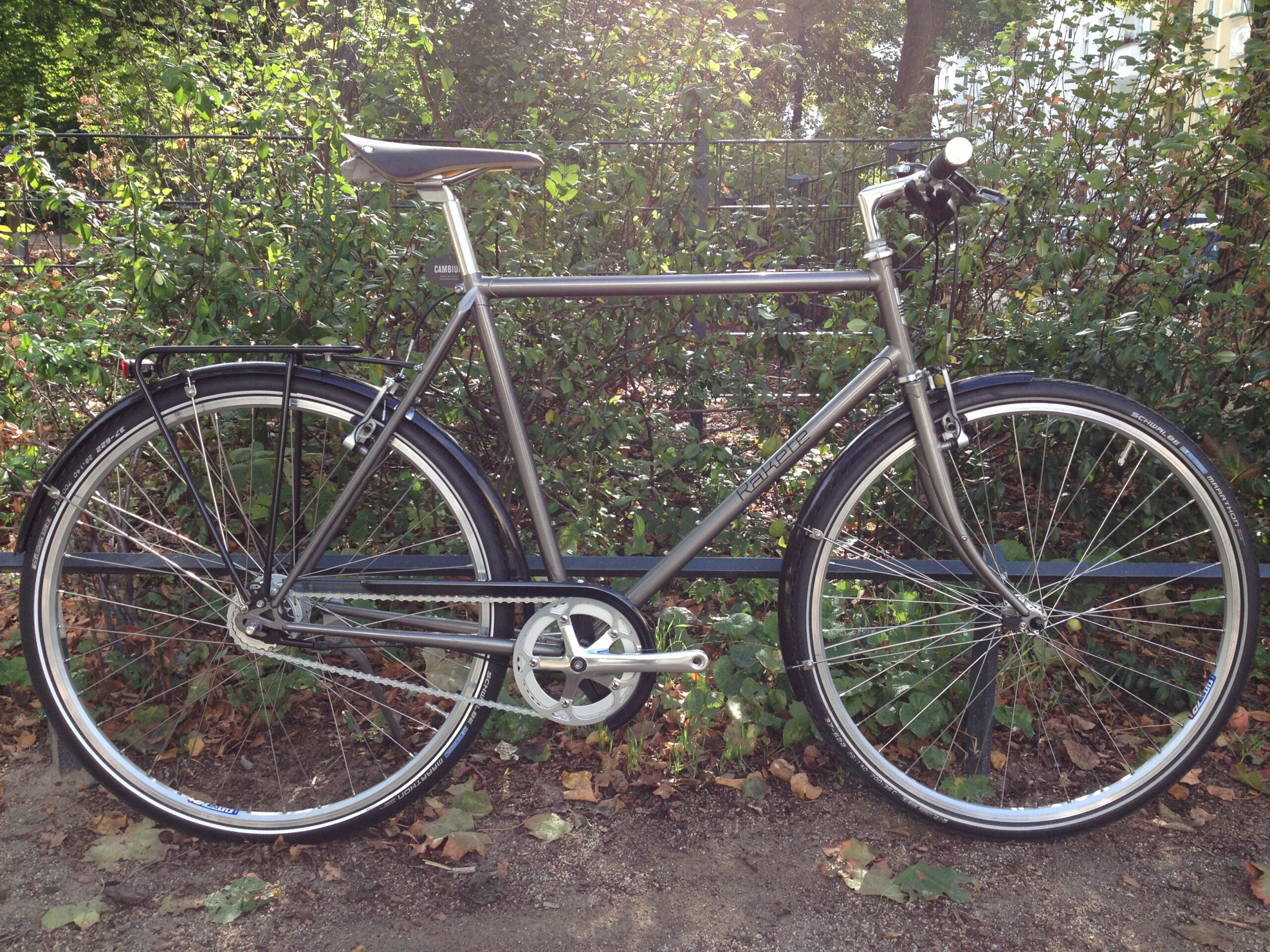Ausgestattet ist es mit Shimano Nexus 8 Freilauf und Rapidfire Shifter, SKS Schutzblechen, Alu Kettenschutz in Schwarz, Gepäckträger Tubus Fly, Deore V-Brake, Tange Vorbau, Flat-Bar, Sattel Brooks Cambium Slate und Brooks Cambium Slate Griffen.