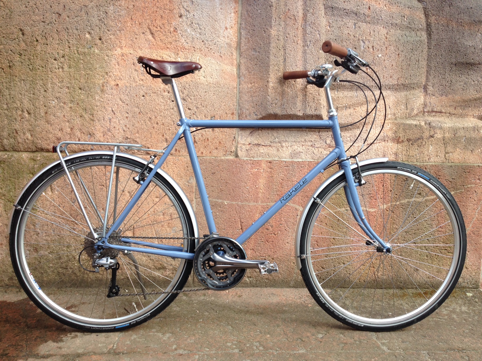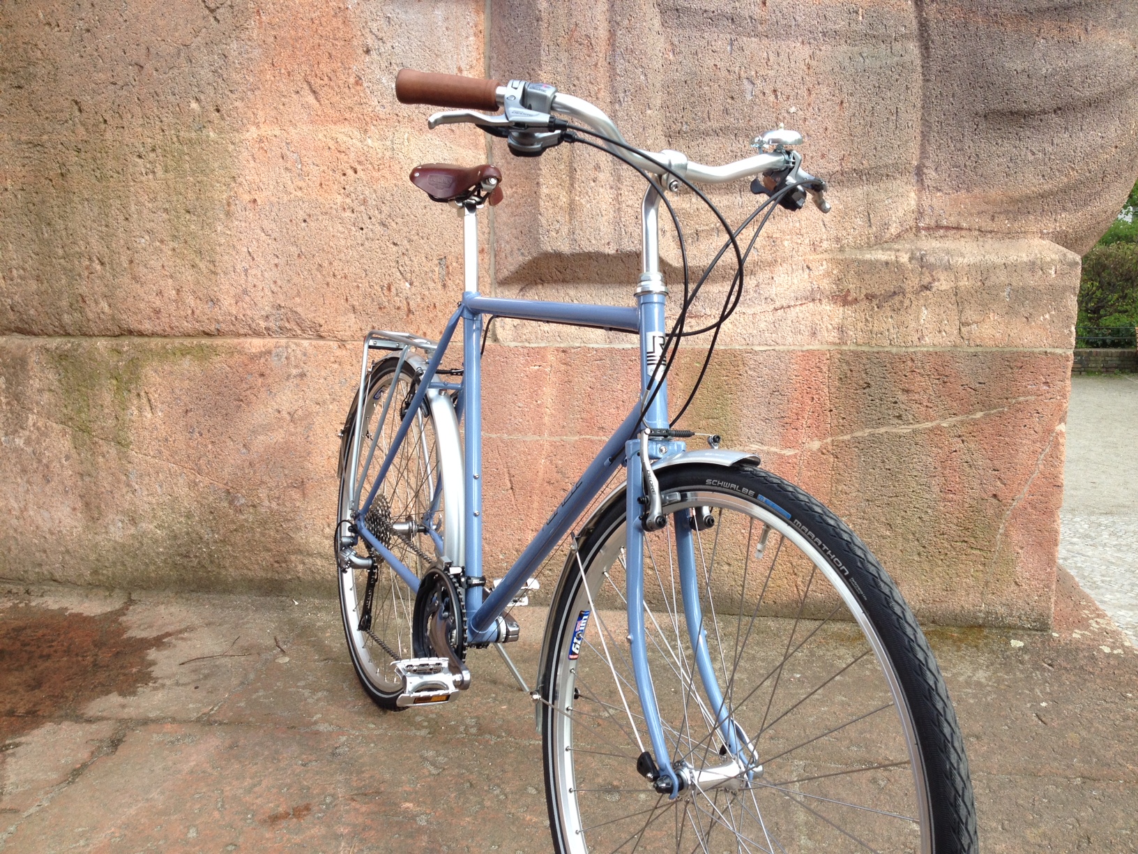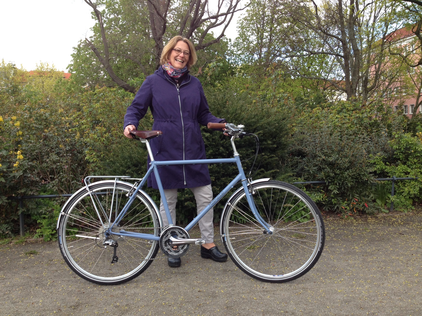 Cara aus Frankreich mit ihrer RAKETE Trekking in Taubenblau mit einer Shimano Deore Kettenschaltung, Bremsen Shimano Deore V-Brake, Schutzblechen von Contec, Gepäckträger Tubus Vega, Humpert Vorbau und Trekking/Climber Lenker, Brooks B17 Sattel in Antibraun und Westpahl Griffen in Leder.