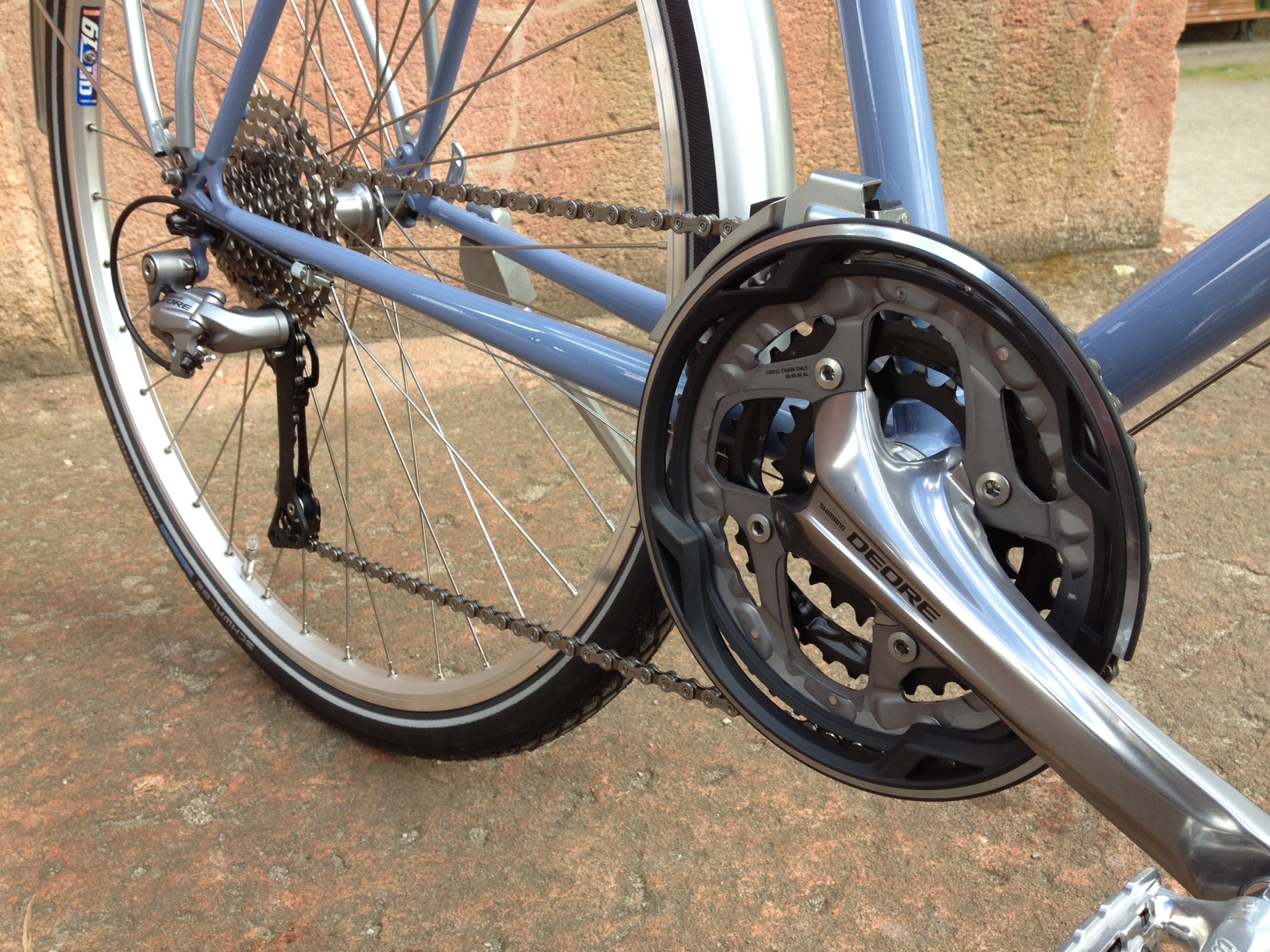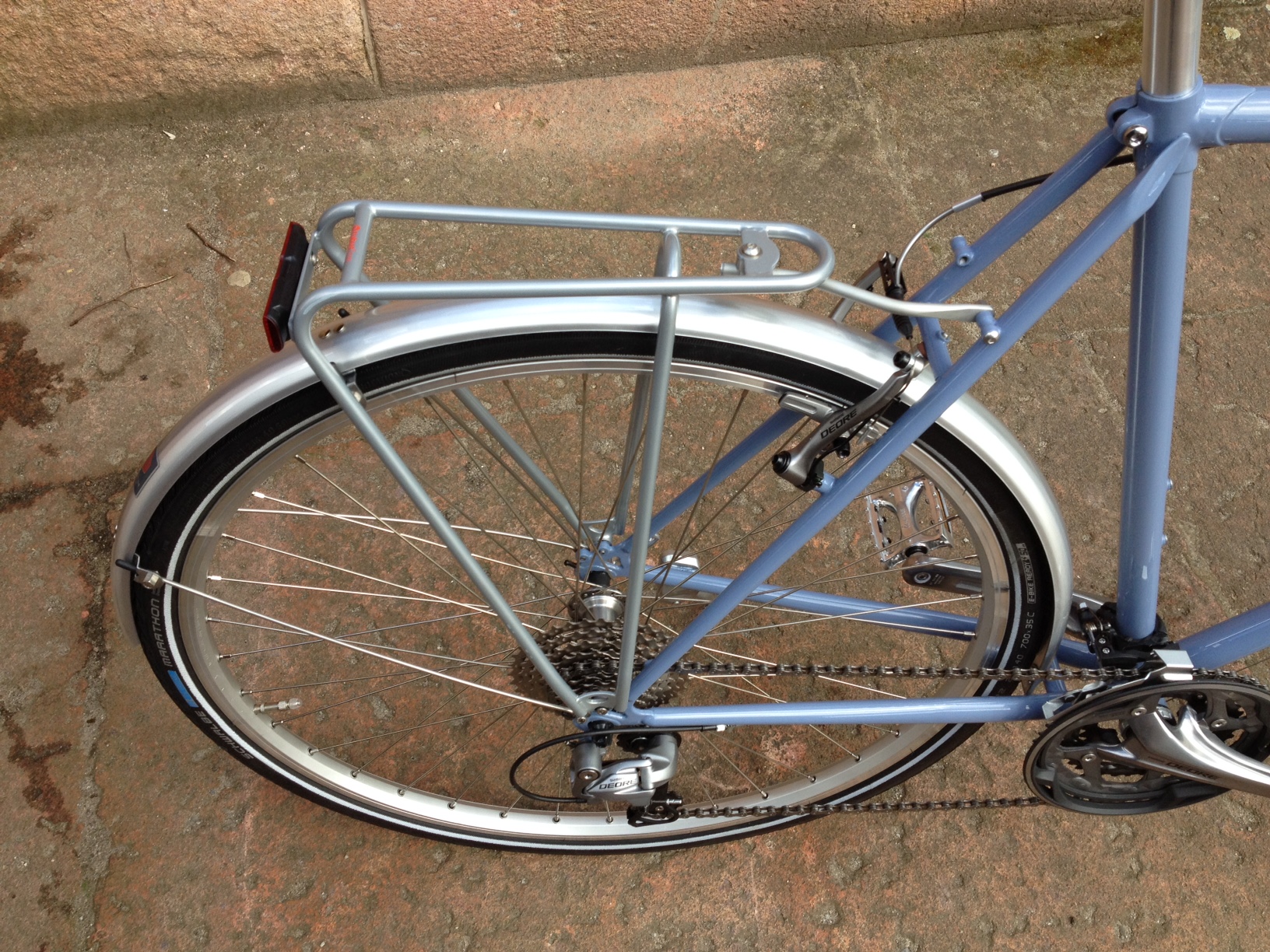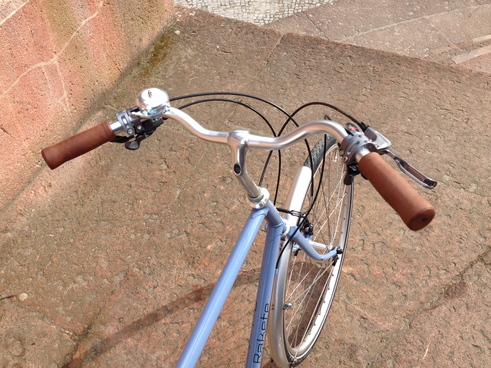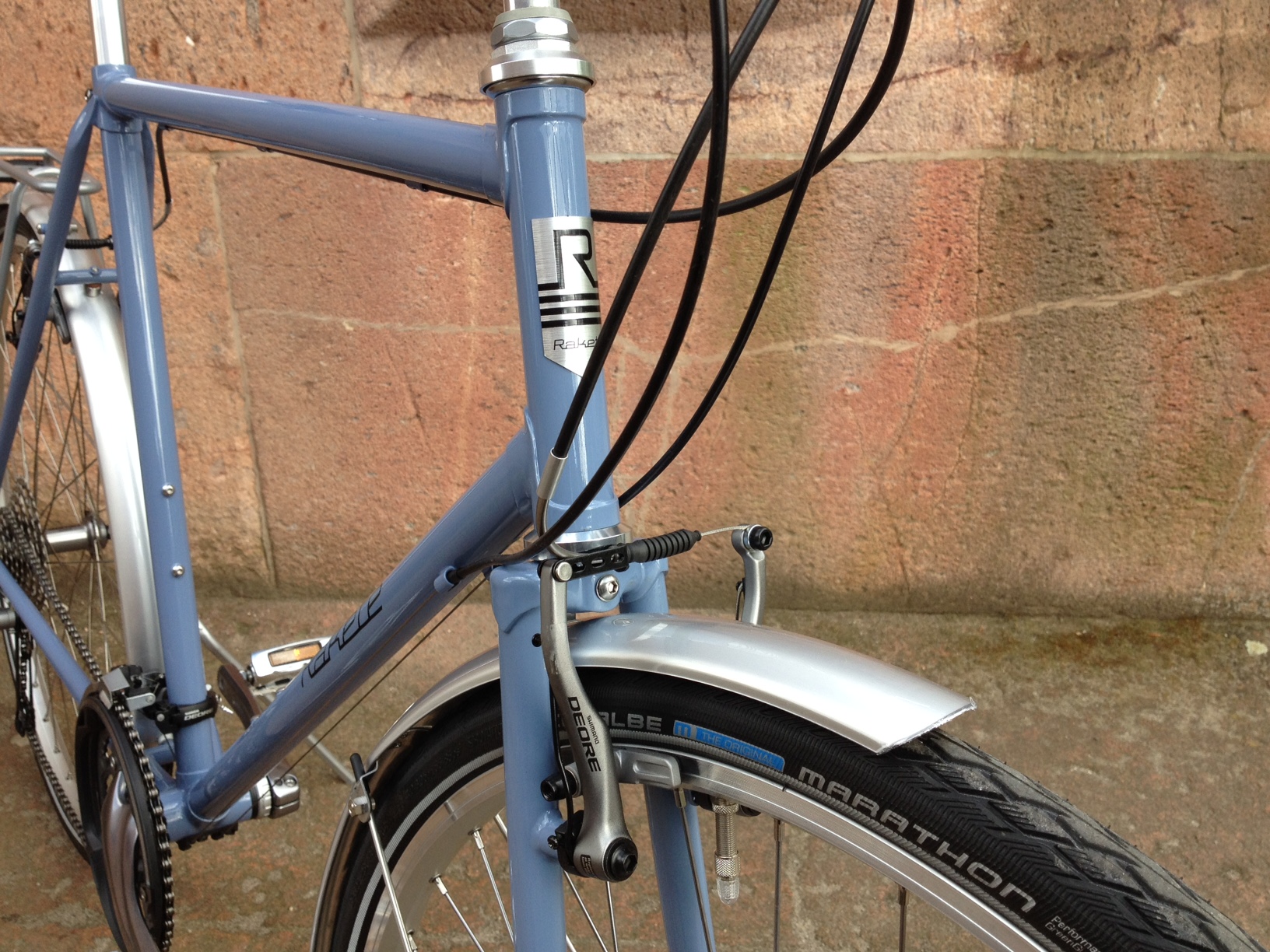 Cara aus Frankreich mit ihrer RAKETE Trekking in Taubenblau mit einer Shimano Deore Kettenschaltung, Bremsen Shimano Deore V-Brake, Schutzblechen von Contec, Gepäckträger Tubus Vega, Humpert Vorbau und Trekking/Climber Lenker, Brooks B17 Sattel in Antibraun und Westpahl Griffen in Leder.