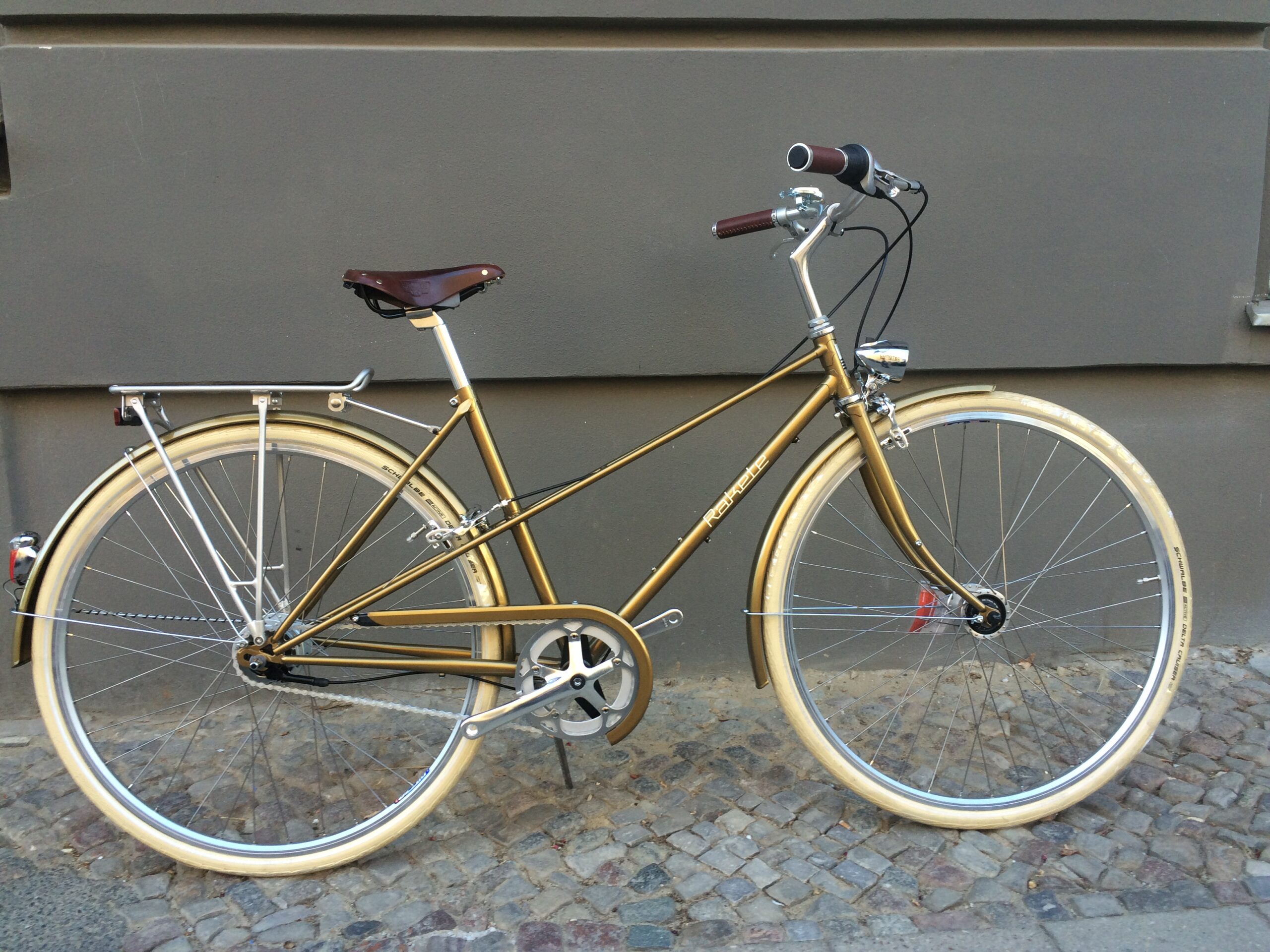 Ausgestattet ist es mit: Shimano Nexus 8 Freilauf, Rapid Fire Shifter, Sportnabendynamo Shimano DH3 N72, Scheinwerfer B&M Lumotec Classic Sensor plus, Rücklicht B&M Seculite Chrom plus, Schutzblechen und Kettenschutz in Rahmenfarbe, Reifen Schwalbe Delta Cruiser Creme, Sattel Brooks B17 Antibraun, Griffe Gyes Antikbraun, Vorbau Humpert, Lenker Trekking-Climber.