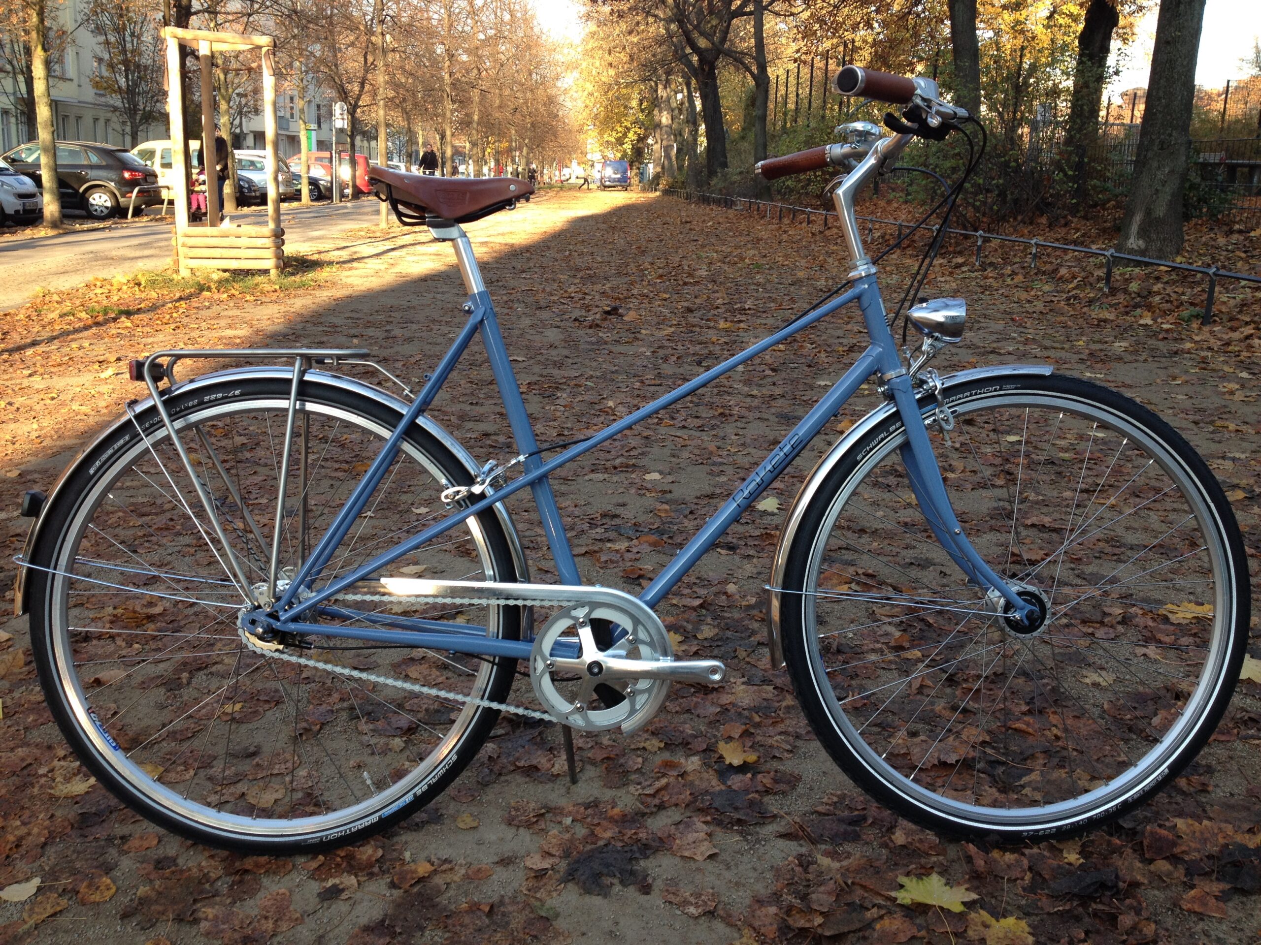 RAKETE Mixte in Taubenblau mit Shimano Nexus 7 Gang Freilauf und Rapidfire Shifter, Humpert Eagle Vorbau, Trekking/Climber Lenker, Schutzblechen in Edelstahl, Kettenschutz Alu-poliert, , Shimano Sportnabendynamo DH3 N72, Scheinwerfer B&M Lumotec Classic Sensor plus, Rücklicht B&M Mini Plus, Gepäckträger Tubus Fly Edelstahl, Brooks B17 Sattel in Honigbraun und Gyes Ledergriffe Ergo in Honigbraun.