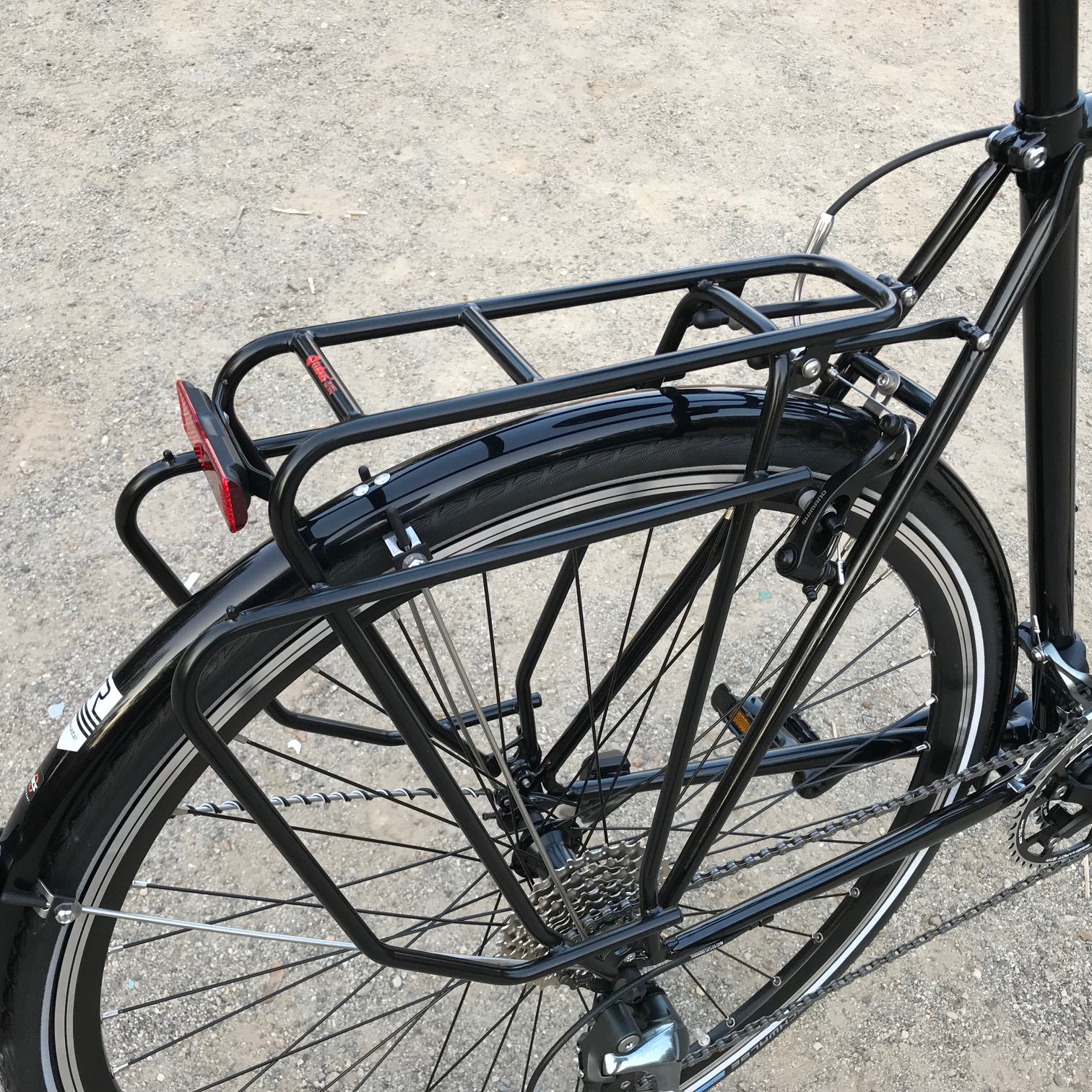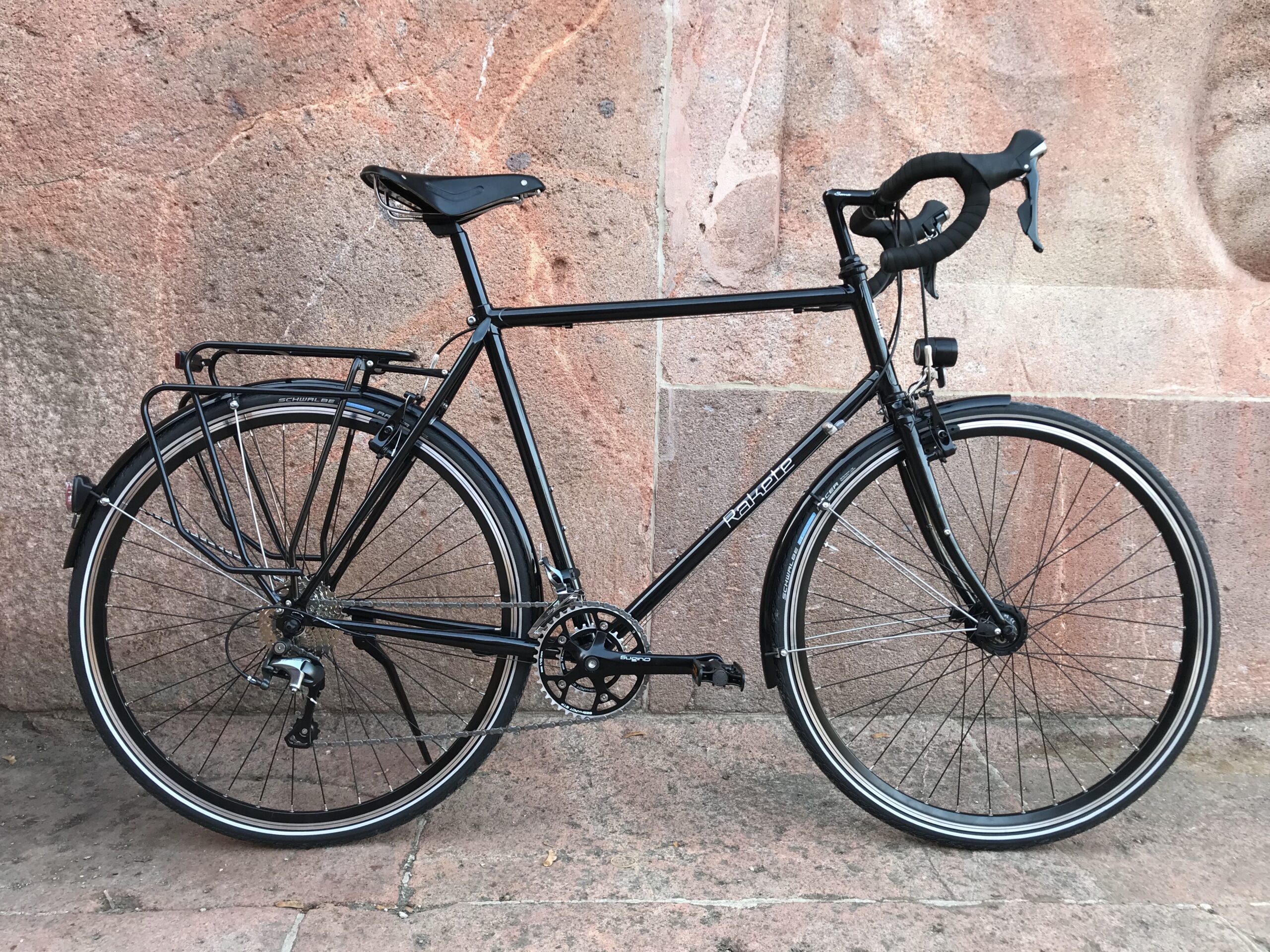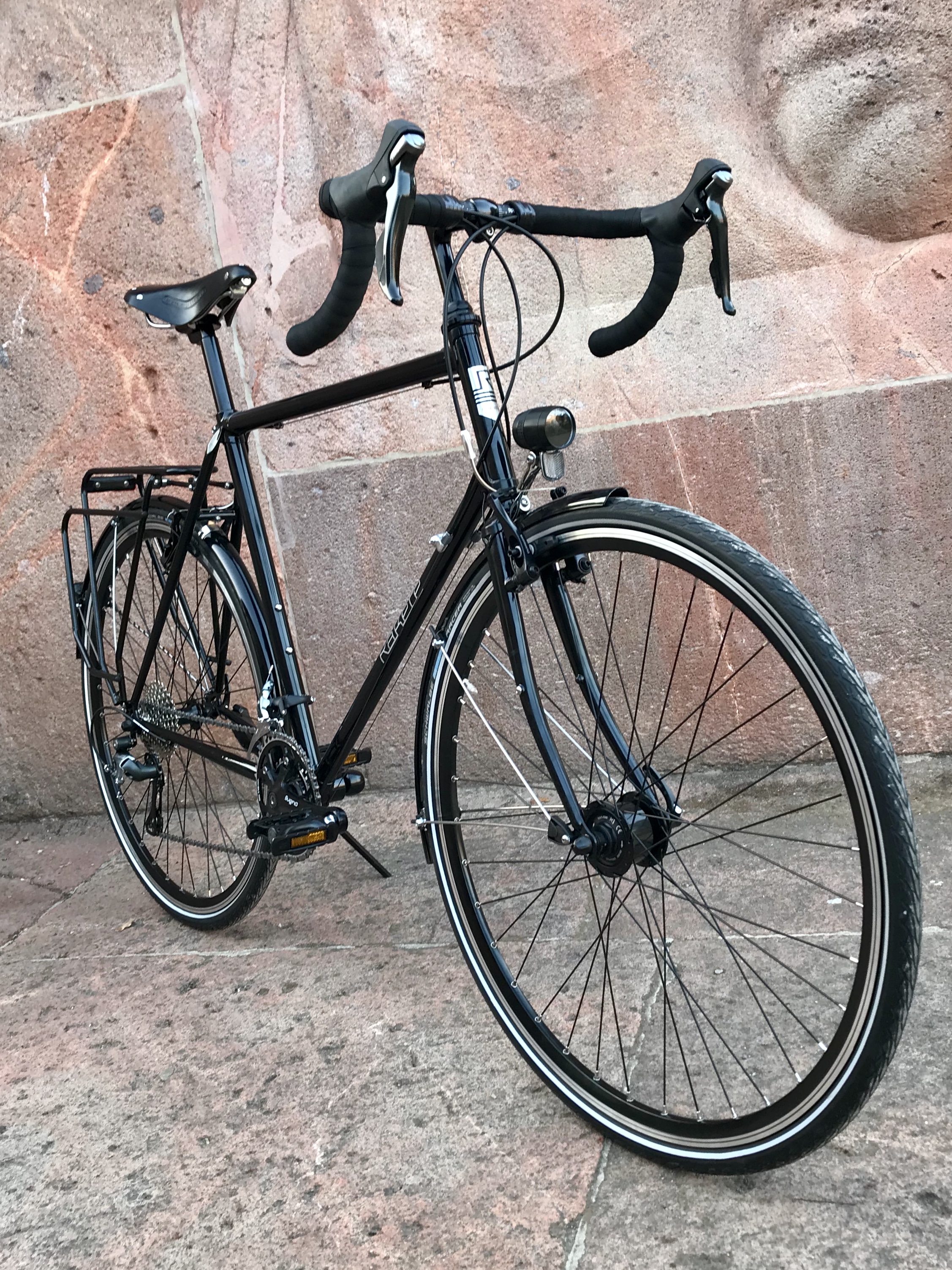 Mit Shimano Tiagra Kettenschaltung, Shimano Mini-V-Brakes, B&M IQ X Scheinwerfer, Tubus Logo Gepäckträger, SKS Schutzblechen und Soma Sutro Vorbau.