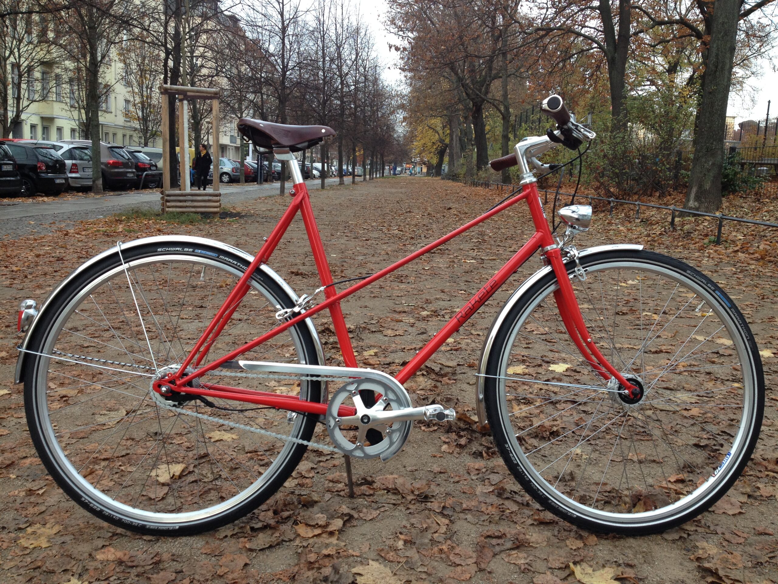 Susanne aus Berlin hat ihre RAKETE Mixte ausgestattet mit: Shimano Alfine 8, Schutzblechen in Edelstahl, Kettenschutz Alu poliert, Sportnabendynamo Shimano DH3N72, Scheinwerfer B&M Lumotec Classic seno plus, Rücklicht B&M Seculite chrom plus, Bügelbremsen, Reifen Schwalbe Marathon, Sattel Brooks B17 Antibraun, Griffe Gyes Ergo Leder Antikbraun, Pedalen MKS IC Lite, Vorbau Tange T 5330 und Moon Lenker.